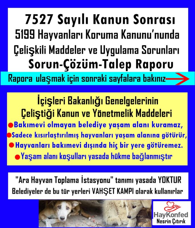 koşullarda başta köpekler için KISIRLAŞTIRMA SEFERBERLİĞİNE hemen başlamaları zorunlu olmalı. - Olmayan belediyelerin yasadaki koşullara uygun bakımevi ve yaşam alanlarını kurup etik ve tıbbi koşullarda kısırlaştırma yapmaya başlamalarına kadar, Bakımevi olan belediyelerin 2 yıl içinde KISIRLAŞTIRMA seferberliği yapıp üreme kontrol altına alınıncaya kadar “VAHŞİ ve KOŞULSUZ TOPLAMA HÜKMÜ” ertelenmelidir. - Bakımevlerinden sahiplenmeye yönelik engeller kaldırılmalıdır. - Kamu vicdanını yaralayan toplumsal tepkilere sebep olan vahşet yaşanan bakımevleri