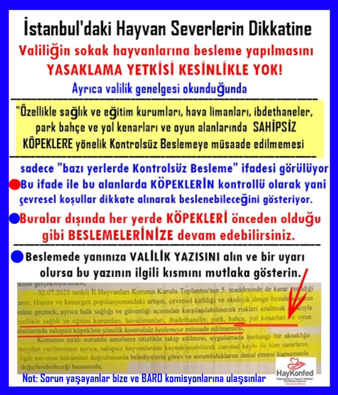 ……özellikle sağlık ve eğitim kurumları, havalimanları, ibadethaneler, park bahçe ve yol kenarları ve oyun alanlarında SAHİPSİZ KÖPEKLERE yönelik kontrolsüz beslemeye müsaade edilmemesi…..” yazdığı açıkça görülüyor.