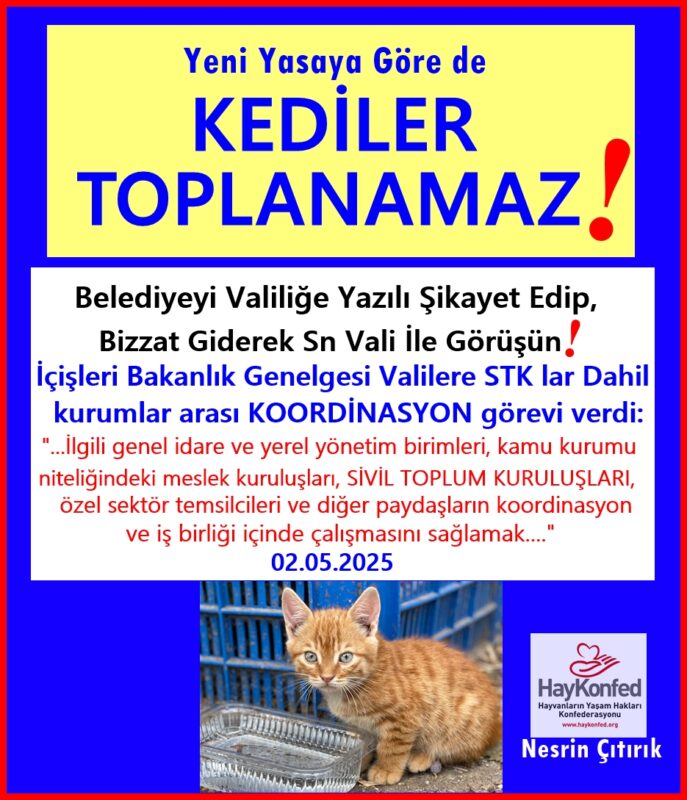 Yasaya aykırı olarak KEDİLERİ toplattıran kanun tanımaz BELEDİYE BAŞKANLARINI, VALİLERE doğrudan yazarak ve bizzat gidip valiler ile görüşerek ŞİKAYET EDİP İDARİ SORUŞTURMA talep ederek, KEDİ TOPLAMANIN durdurulmasının sağlanmasını ısrarla isteyiniz.