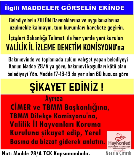 5- İl Hayvanları Korulu Başkanlığına da yazılı şikayette bulununuz. Özellikle YEREL BASINNDA bunu dile getiriniz.