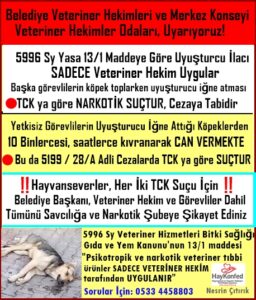 2-) Yeni değişen 5199 sy Hayvanları Koruma Kanununa LAF CAMBAZLIĞI ile uyuşturcu iğne "veteriner hekim KOORDİNASYONUNDA yapılır" ifadesi konarak, 5996 sy kanuna ve TCK ya aykırı olarak veteriner hekim yetkisi toplamacılara verilmiş gibi yapılmıştır.